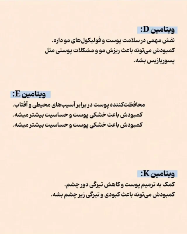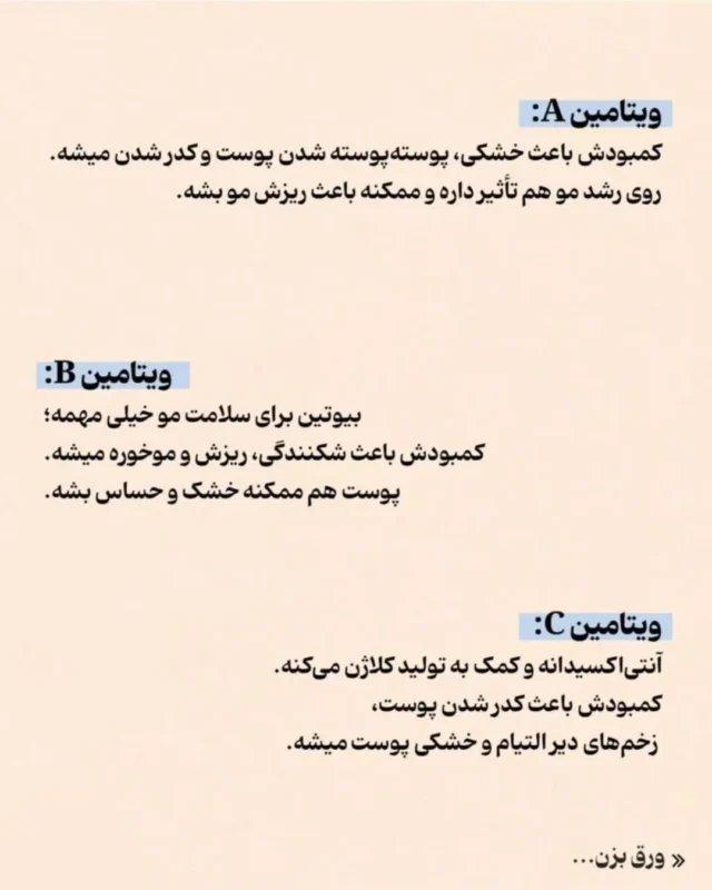 کمبود ویتامین‌ها می‌تواند باعث کاهش تولید کلاژن، خشکی و التهاب پوست، ریزش و شکنندگی مو و حتی پیری زودرس شود. به همین دلیل، شناخت و دریافت متعادل ویتامین‌های ضروری، کلید اصلی داشتن ظاهری سالم و درخشان است.